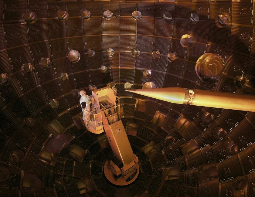 And just for fun, here is a pic of 1/4th of the LASERs tubes at NIF, the entire facility is as big as 3 American football fields! Again, workers are there for scale.