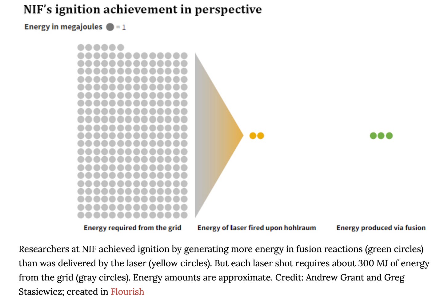 This is not the most energy ever created through fusion--that goes to the UK Atomic Energy Authority's Joint European Torus in Oxford which uses giant magnets instead of LASERs, and generated 59 MJ earlier this year. But this is the highest ratio of energy generated to energy used through nuclear fusion--we produced 50% more energy than we put in, at 3 MJ. Now, this is only measuring the LASER power itself. LASERs actually require a TON of energy themselves to power (300X more than what we got out), and we have a lot of work to go before we break even there. Here is an infographic demonstrating the energy in and out in this reaction (fun fact: hohlraum is the container that they hold the fuel in, and when I was working there, they were considering using spider silk!).