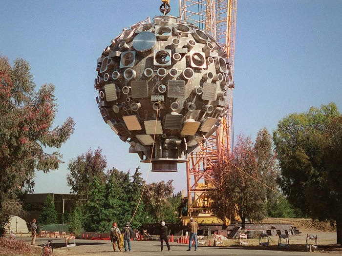 This experiment works by creating a fuel out of different isotopes of hydrogen and igniting that fuel with 192 LASERs in a giant chamber! Here is a photo of the chamber while they were installing it last century (1997). Each of those circles is a place where either a LASER or a detector can penetrate the chamber.